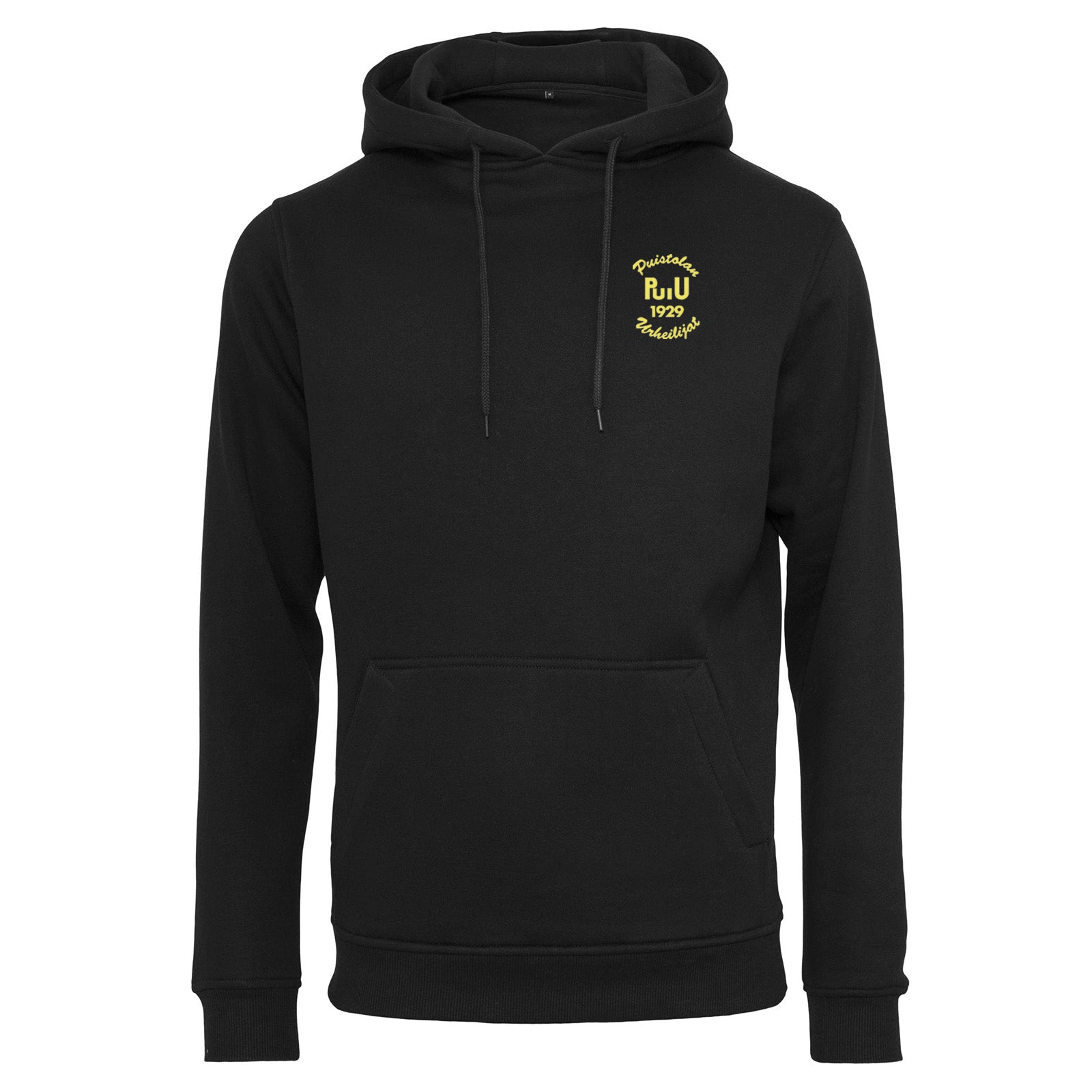 Musta huppari kultaisella Puistolan Urheilijat logolla.